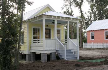 The Original Katrina Cottage THE KATRINA COTTAGE is a small, sturdy house that can be delivered at the cost of a FEMA trailer. It may be temporary or permanent. Some permanent models are designed to expand into full-sized dwellings. ![]() Katrina Cottages are built with hurricane-resistant materials and are designed to withstand hurricane force winds. A Katrina Cottage must meet the International Building Code (IBC) as adopted by Mississippi and Louisiana, and should be installed to FEMA flood elevation guidelines, if applicable. It may be built of any technology or delivery system, including mobile home standards, pre-manufactured elements, panelization, or site-built of any material. It is estimated that the 308 sf model can be delivered on the Gulf for about $70,000 per unit including construction, which is less than the dispiriting FEMA trailers have been costing American taxpayers during their brief 18-month life span. THE KATRINA COTTAGE SERIES is available in plan or kit form to anyone, public or private. While designed at the Mississippi Renewal Forum immediately after Katrina for emergency housing, they may be useful as reasonably priced housing anywhere. The Cottages are useful for camps, beach houses, hunting lodges, guest cottages, and reasonably priced, well-designed primary housing in any part of the world. |